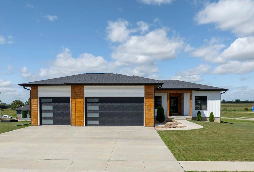 Designed to Delight! This brand-new 5 bedroom, 3.5 bath ranch has all the space and style you’ve been looking for! Not only is it new construction, but it also comes with the perk of tax abatement to ease your expenses. From the moment you pull up, the modern curb-appeal with wood accents, sleek garage doors and welcoming covered entry makes a big impression. Step inside to soaring specialty ceilings with wood beams, a cozy electric fireplace with custom built-ins, and large windows that fill the space with natural light. The kitchen is a showpiece featuring a waterfall quartz island with breakfast bar seating, custom cabinetry, a gorgeous wood range hood, and ample pantry space to keep everything organized. The dining area overlooks the yard and flows right out to the covered deck, perfect for grilling, relaxing, or entertaining. The primary suite is amazing! You’ll love the spacious bedroom, spa-like bath with dual vanities, a soaking tub, a walk-in tiled shower with two shower heads, and an oversized walk-in closet. Two more bedrooms and a full bath sit on the main floor, along with laundry room and a great half bath for guests. Head downstairs to find a huge open lower level with a wet bar, family room, two additional bedrooms, another full bath, and plenty of space for your in-home theater or pool table setup. Outside, the home sits on a corner lot in a private cul-de-sac with a spacious yard and an oversized 3-stall garage. And the location? Just minutes from Cedar Valley bike trails, Lost Island Parks, Isle Casino, and more! This home truly has it all...style, thoughtful details, plenty of room to roam in a location you’ll love! Call for a private showing today!