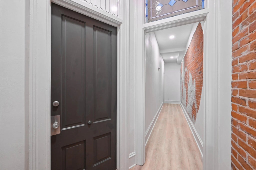 Downtown Waverly apartment near a scenic trail and popular restaurant offers a lively urban vibe. It has a river view from a composite deck, great for coffee, sunset, or gatherings. Inside, it features a quartz kitchen countertop, closed cabinets, a brick accent wall, a cozy fireplace, and an in-unit washer and dryer.