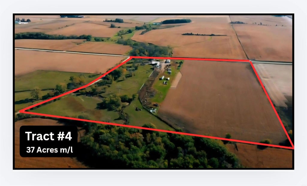Chickasaw County, Iowa – Agricultural Property Auction Tract #4 | 37 Acres ± with Dwelling & Outbuildings Auction Date: March 10 Time: 10:00 AM Auction Type: Online & Live Location: Cedar Valley Property Solutions, Charles City, Iowa Property Description: Tract #4 consists of 37 acres m/l located in Chickasaw County, Iowa, featuring an agricultural dwelling and multiple outbuildings. The property includes an older farmhouse built in 1900, offering approximately 1,800 square feet of living space with 5 bedrooms and 1 bathroom. The home is situated on a building site and is being sold As-Is, Where-Is, and is considered to be in below-normal condition. Land Breakdown (approximate): Tillable Acres: 17.85 acres m/l Non-Tillable Acres: 16.50 acres m/l Improvements: Steel machine shed with concrete floor – approximately 2,400 square feet Several additional outbuildings This tract offers a combination of tillable farmland, storage potential, and a rural building site, making it suitable for agricultural use, redevelopment, or investment. Auction Terms: Property sells subject to auction terms and conditions. Acreages are approximate.