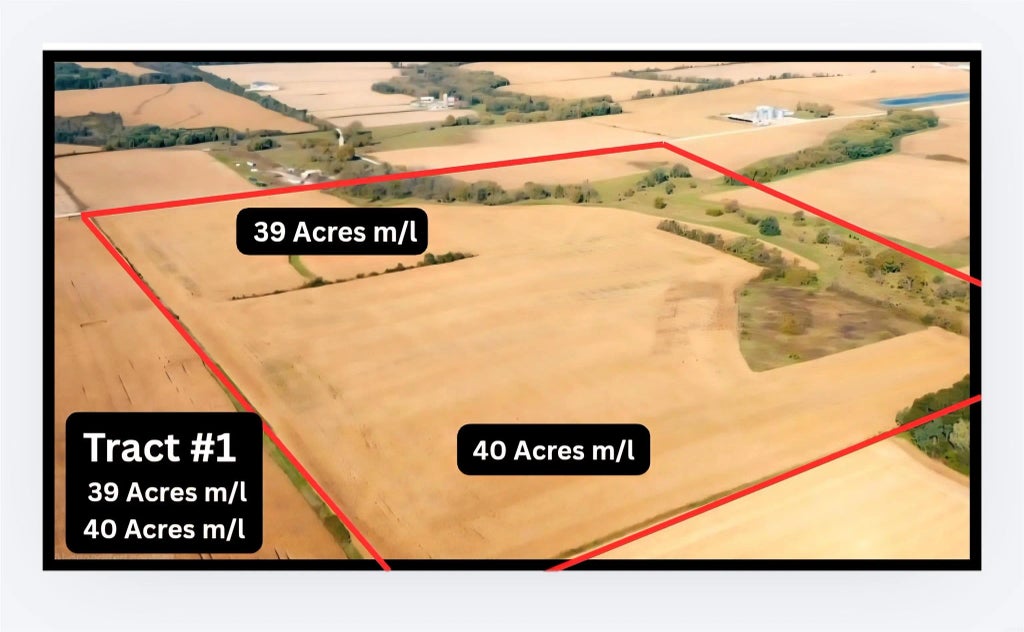 Chickasaw County, Iowa – Agricultural Property Auction Tract #1 | 39 Acres ± and 40 Acres ± Auction Date: March 10 Time: 10:00 AM Auction Type: Online & Live Location: Cedar Valley Property Solutions, Charles City, Iowa Property Description: Tract #4 consists of two parcels #190520325001 39 acres m/l and #190519400001 40 acres located in Chickasaw County, Iowa. Land Breakdown (approximate): Tillable Acres: 17.85 acres m/l Non-Tillable Acres: 16.50 acres m/l Auction Terms: Property sells subject to auction terms and conditions. Acreages are approximate.